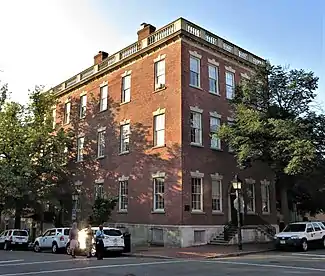 The Bank of Alexandria is a historic bank building located at Alexandria, Virginia, United States. It was built in 1807, and consists of a three-story main block, with a two-story east wing. The main block is five bays wide and 7 bays deep. In 1848, James Green purchased the building and turned it into a hotel, then in 1855, he expanded it across the lawn of the Carlyle House next door, tripling the size of the Mansion House Hotel. The hotel was used as a hospital during the Civil War. In the late 1960's, the expansion, by then an aging apartment building, was torn down by the Northern Virginia Regional Park Authority to reveal Carlyle House, which was restored in 1976.[3][4]