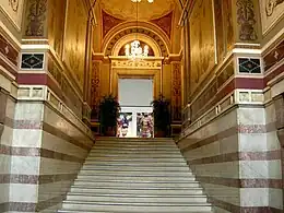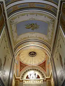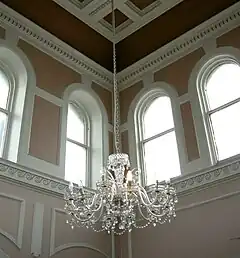 This is now the entrance hall and shop, and the walls are used to display temporary exhibitions. The saloon was also the grand hall, reception room, picture gallery and ballroom, with a little furniture at the sides, many oil paintings and gasoliers. It has rooflights with painted plaster decorations in the classical style around them. The marble fireplace features two large putti holding trumpets. Putti are also the central feature on the grand staircase ceiling – possibly a wistful element as Akroyd and his wife had no children.[2]