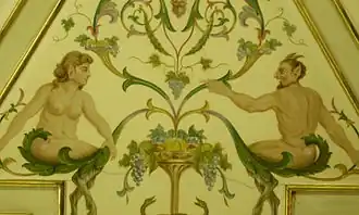 The library was originally also the smoking room, so it is surprising that the original painted ceiling has survived and could be fully restored. The ceiling is heavily painted, gilded and sculptured in an eclectic manner, taking its general design from classical sources. The background is cream, but there is much use of Pompeiian red, an earth colour which gained popularity in Victorian England after the renewed excavations by Giuseppe Fiorelli in 1860. Small panels feature clearly painted classical motifs and portraits with distressed backgrounds, to look like pieces of ancient frescoes. Four medallions show the named poets Shakespeare, Milton, Chaucer and Tennyson, all admired by the Romantics. All the spaces on the cream background are filled with illustrations imitating the original maiolica style, featuring stylised goats and fauns, cornucopia, grapes, birds and flowers, but also angels and putti in the centre. The decoration around the edge has a Green Man.[2]