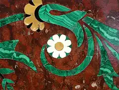 The fireplace is red Rouge de Rance marble with cream and black marble, patterned with inlaid semi-precious stone including green malachite: all imported materials. The intertwined initials of Edward and Elizabeth his wife are central on the fire surround and fireback, which is prominently dated 1867. The inlay features the White Rose of Yorkshire, possibly in Parian marble, which is repeated on the carved corinthian columns on the fire surround. The mantelshelf is massive enough to support three lifesized marble busts: Edward Akroyd on the left, his father Jonathan in the centre, and his wife Elizabeth Fearby (d.1884) on the right (by the Florentine sculptor Niccolò Bazzanti (1802–1869)). The bust of Elizabeth is remarkable in that it has the trompe-l'œil effect of a veil over the face. The glazed hearth tiles are similar to Mintons tiles but are probably locally made.[2]