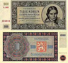 In 1945, four kinds of banknotes of Czechoslovak koruna were introduced. The first were issues of Bohemia and Moravia and Slovakia, to which adhesive stamps were affixed. Denominations issued were 100, 500 and 1000 korun. The second (dated 1944) were printed in the Soviet Union and were issued in denominations of 1, 5, 20, 100, 500 and 1000 korun. The third were locally printed notes issued by the government in denominations of 1, 5, 10, 20, 50, 100, 500, 1000 and 2000 korun. The fourth were issues of the National Bank of Czechoslovakia, in denominations of 1000 and 5000 korun. The National Bank issued 500 korun notes from 1946, whilst the government continued to issue notes between 5 and 100 korun, the 1 koruna note being replaced by a coin in 1946.