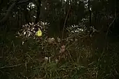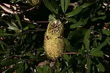 Flowering has been recorded between January and October, with a peak in autumn and early winter (April to June).[6] The inflorescences, or flower spikes, arise from the end of 1 to 5 year old branchlets, and often have a whorl of branchlets arising from the node or base. Measuring 5–15 cm (2.0–5.9 in) high and 4 cm (1.6 in) wide, the yellow spikes often have blue-grey tinged limbs in bud,[3] though occasionally pinkish, mauve or mauve-blue limbs are seen.[7] Opening to a pale yellow after anthesis, the spikes lose their flowers with age and swell to up to 17.5 cm (6.9 in) high and 4 cm (1.6 in) wide, with up to 80 follicles. Covered with fine fur but becoming smooth with age, the oval-shaped follicles measure 1–1.8 cm (0.39–0.71 in) long by 0.2–0.7 cm high (0.1–0.3 in) and 0.3–0.7 cm (0.12–0.28 in) wide.[3] The bare swollen spike, now known as an infructescence, is patterned with short spiky persistent bracts on its surface where follicles have not developed.[5] Each follicle contains one or two obovate dark grey-brown to black seeds sandwiching a woody separator. Measuring 1.2–1.8 cm (0.47–0.71 in) long, they are made up of an oblong to semi-elliptic smooth or slightly ridged seed body, 0.7–1.1 cm (0.28–0.43 in) long by 0.3–0.7 cm (0.12–0.28 in) wide. The woody separator is the same shape as the seed, with an impression where the seed body lies next to it.[3] Seedlings have bright obovate green cotyledons 1.2–1.5 cm (0.47–0.59 in) long and 0.5–0.7 cm (0.20–0.28 in) wide, which sit on a stalk, or 1 mm diameter finely hairy seedling stem, known as the hypocotyl, which is less than 1 cm high. The first seedling leaves to emerge are paired (oppositely arranged) and lanceolate with fine-toothed margins, measuring 2.5–3 cm long and 0.4–0.5 cm wide. Subsequent leaves are more oblanceolate, elliptic (oval-shaped) or linear. Young plants develop a lignotuber in their first year.[3]