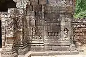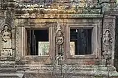 The second enclosure, which is part of the main temple, measures 58 m × 50 m (190 ft × 164 ft). It has a gopura on its eastern side and also subsidiary gopura on the west. Entrance doors are at the northern and southern ends.[4] The gopura is built like a gallery with one exterior wall and double row of pillars which open into a courtyard and which has mostly shored up walls with small openings at the bottom to allow air circulation. The niches here are decorated with images of apsaras, and a Buddha statue in the central hall has been defaced by vandals. Bayon style architectural features built-in are the "balustered false windows with lowered blinds and devatas with headdresses in the form of small flaming discs set in a triangle." The vaults built in sandstone and laterite have collapsed at several locations of the gallery.[12] The inner enclosures contain library building to its north and south and also a central sanctuary.[7]