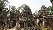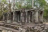 Banteay Kdei (Khmer: ប្រាសាទបន្ទាយក្តី; Prasat Banteay Kdei, lit. 'A Citadel of Chambers'),[1] also known as "Citadel of Monks' cells",[2] is a Buddhist temple in Angkor, Cambodia. It is located southeast of Ta Prohm and east of Angkor Thom. Built in the mid-12th to early 13th centuries AD during the reign of Jayavarman VII (who was posthumously given the title "Maha paramasangata pada"[3]), it is in the Bayon architectural style, similar in plan to Ta Prohm and Preah Khan, but less complex and smaller. Its structures are contained within two successive enclosure walls, and consist of two concentric galleries from which emerge towers, preceded to the east by a cloister.[4][5]