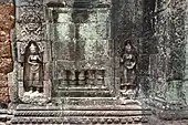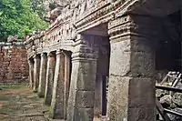 The third enclosure has a gopura which has a cruciform plan. It has pillars which are crossed by vaults. There are three passages in this enclosure, two on either side are independent, with laterite walls. The niches here have small figurines, and large apsara devatas in single poses or in pairs of dancing poses. Large Buddha images, in an internal courtyard of this enclosure, have been defaced by vandals. A paved access from here leads to the main shrine, which comprises two galleried enclosures. At the entrance to these enclosures, from the eastern end, is the "Hall of Dancers", which has four open courtyards and the pillars have fine carvings of apsaras.[12]