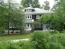 Barker House is a historic home located at Michigan City, LaPorte County, Indiana. It was built about 1900, and is a two-story, rectangular, Shingle Style / Prairie School style dwelling. It sits on a brick foundation and has a hipped roof with hipped dormer and has a modified American Foursquare plan. Also on the property are the contributing carriage house, dance studio, and garage.[2]: 5 The house and grounds are occupied by the Save the Dunes offices and Barker Woods Nature Preserve, which is managed by Shirley Heinze Land Trust.