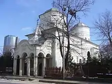 When the original roof burned, it was rebuilt by Lupu. It is believed that the church was covered in tiles, but following an 1836 fire that affected large parts of the city, a new roof of tin plates was installed.[1] The church functioned as a monastery for a time, and was the official guesthouse for Orthodox patriarchs visiting Moldavia. Its cells hosted a school taught in Greek.[2] In 1983, during systematization, the annexed buildings were demolished,[1] and apartment blocks were built on the land, up to the church door.[2] Aside from the church, only the bell tower and an adjacent basement remained. Renovation work on the interior and exterior began in 1994.[1]