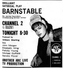 Barnstable is a 1963 Australian television play which had been performed on British TV.[4][5][6] It was filmed in Melbourne. Sandra Power was the barrell girl from In Melbourne Tonight making her acting debut.[1]