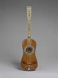 The Baroque guitar replaced the Renaissance lute as the most common instrument found when one was at home.[2][3] The earliest attestation of a five-stringed guitar comes from the mid-sixteenth-century Spanish book Declaracion de Instrumentos Musicales by Juan Bermudo, published in 1555.[4] The first treatise published for the Baroque guitar was Guitarra Española de cinco ordenes (The Five-course Spanish Guitar), c. 1590, by Juan Carlos Amat.[5][6]