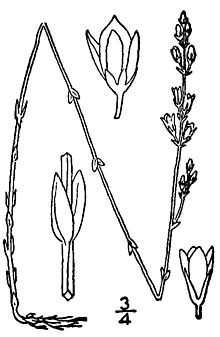Bartonia virginica is an annual plant,[3] that typically has simple stems that are wiry and erect. The stems are 1–4 dm tall, with opposite, strongly ascending branches. The leaves are scale-like usually opposite. The flowers are arranging in racemose or paniculate inflorescence, which have commonly opposite, very upright branches and pedicels. Each flower is 3–4 mm long with lance-subulate shaped sepals. The petals are oblong in shape and usually have denticulate margins and are abruptly narrowed to a rounded or obtuse, often mucronate tip. The anthers are minutely apiculate. It flowers late summer. The diploid (2n) chromosome count is fifty-two.[4][5]