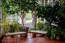 When the house was renovated by the IGC in 1915, the right or south wing of the house contained an "orangery" for serving tea.[15][70] The orangery, also described as a conservatory,[16][6] was described by Harper's Bazaar as having French windows, white walls, cement floors, and a domed ceiling.[70] One of the smaller rooms in the northern wing was turned into a secondary reception room with a green, black, and coral color scheme, while another room became a boardroom with gray walls and black marble mantel. A stair led to the IGC's writing room and library on the northern wing's second floor.[70]