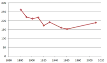 According to census information, the population of Barugh has declined since 1881, decreasing from 261 in 1881 to 153 in 1961. The population saw slight increases in 1911 and 1931.[11] The 2011 census indicates that the population of Barugh is 189.[1]