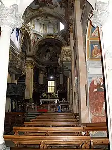 The Baroque look is due to the decorations in the apse semi-dome and in the central aisle vaults: there are frescos by Carlo Borsetti representing the Trinity, the Ascent and glory of Saint Julius with Elijah, Demetrius, Philibert of Jumièges and Audenzio, all buried in the church together with the patron saint. In the left chapel (so called Assumption chapel) there is a painting by Francesco del Cairo of the Assumption of Mary; in the transept there is the great canvas Saint Julius meets Saint Audenzio by Giuseppe Zanatta and Saint Julius subjugating the wolf by Giorgio Bonola.