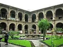 The Basilica of La Merced was founded by Friar Sebastián de Trujillo Castañeda between 1535 and 1536.[5][6] By 1538, Francisco Pizarro donated to the Mercedarians the estate called Limpipata adjacent to the Kusipata square where the construction of the first Mercedarian church in the city began.[6] The current church replaced the first church destroyed by the earthquake of 1650. The current church had to be built between 1651 and 1670 while the tower had to be built between 1692 and 1696 as well as the second cloister of the convent.