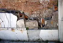 This bath (I, XIX, 5)(c. 385 square meters) was built in late antiquity around 450-500 C.E. reusing Hadrianic bricks.[28] It was accessible only from the warehouse to the east of it. It is one of the last building projects before the abandonment of the city.[29] The building was constructed above the rubble of the collapsed insulae and reused many of the rooms in the area for the bath such as the street entrance of a former shop being converted into the apodyterium.[30][31]