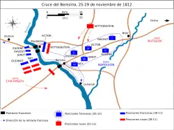 By midday of the 27th, Napoleon and his Imperial Guard were across. One of the spans broke in the late afternoon, but the engineers had it repaired by early evening.[24] The corps of Marshal Davout and Prince Eugene were able to cross before the day ended. The last unit on the eastern bank, Marshal Victor's IX Corps was given the order to defend against the approach of Wittgenstein who had then reached Borisov. As a part of that operation, French General Louis Partouneaux's 12th Division of the IX Corps suffered a great defeat, surrendering over 8,000 men when they were overwhelmed by Wittgenstein at Staroi-Borisov.[25][26]