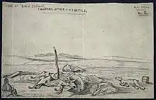 Finally on the morning of September 3, 1862, Sibley arrived at Birch Coulee with a massive infantry force and artillery, including the remaining six companies of the 6th Minnesota, bolstered by the arrival of Lieutenant Colonel William Rainey Marshall and two companies of the 7th Minnesota Infantry Regiment at Fort Ridgely.[1] The shelling forced the Dakota to disperse, and Sibley entered Brown's camp around 11am on September 3. He encountered a "sickening sight," with 13 soldiers dead on the ground,[2] over 90 horses dead, and 47 men severely wounded. (Five men died later of their wounds.[2] Grant wrote many years later that a total of 22 men were killed at Birch Coulee,[3] suggesting that there were also civilian deaths not counted toward the militia totals.) The survivors, finally relieved from duty at 12 noon, were exhausted from a thirty-one hour siege without water, rest or food.