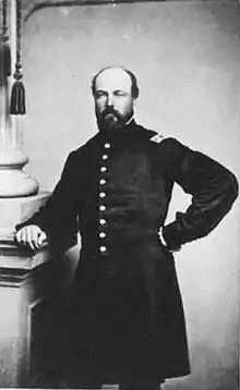 On August 31, Sibley sent two militia units along with 17 teamsters from Fort Ridgely who would bury the dead: Company A of the 6th Minnesota Volunteer Infantry Regiment commanded by Captain Hiram P. Grant, and Company A of the Cullen Frontier Guards, including 70 mounted men under Captain Joseph Anderson.[2] They were accompanied by approximately 20 civilians who had asked to join the burial party, including former Indian agent Major Joseph R. Brown, who would be able to lend his expertise in the Dakota "character and country."[5][6] Brown himself was looking for his wife and children, unaware that they were alive and safe in the "friendly" Dakota camp with Gabriel Renville (Ti'wakan) after being rescued by Akipa on August 23.