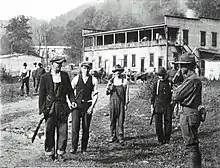 This gunfight became known as the Matewan Massacre, and its symbolic significance was enormous for the miners. The seemingly invincible detective agency Baldwin–Felts had been beaten.[17] Chief Sid Hatfield became an immediate legend and hero to the union miners, and a symbol of hope that the oppression by coal operators and their hired guns could be overthrown.[18] Throughout the summer and into the fall of 1920 the union gained strength in Mingo County, as did the resistance of the coal operators. Sporadic shootouts occurred up and down the Tug River. In late June state police under the command of Captain Brockus raided the Lick Creek tent colony near Williamson. Miners were said to have fired on Brockus and Martin's men from the colony, and in response the state police shot and arrested miners, ripped the canvas tents to shreds and scattered the mining families' belongings.[19] Both sides were bolstering their arms, and Sid Hatfield continued to fuel the resistance, specifically by converting Testerman's jewelry store into a gun shop.[20]