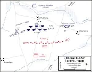 The Battle of Breitenfeld (German: Schlacht bei Breitenfeld; Swedish: Slaget vid Breitenfeld) or First Battle of Breitenfeld (in older texts sometimes known as Battle of Leipzig), was fought at a crossroads near Breitenfeld approximately 8 km north-west of the walled city of Leipzig on 17 September (Gregorian calendar), or 7 September (Julian calendar, in wide use at the time), 1631.[lower-alpha 2][lower-alpha 1] A Swedish-Saxon army led by King Gustavus Adolphus of Sweden and Saxon Elector John George I defeated an Imperial-Catholic League Army led by Generalfeldmarschall Johann Tserclaes, Count of Tilly. It was the Protestants' first major victory of the Thirty Years War.