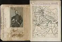Scott's men had to move uphill through some rolling hills, valleys and ravines to reach the Confederate fortifications.[36][37] Despite heavy fire, including canister, and the movement of Brigadier General William Forney's Alabama brigade to the left to protect the flank, some of the Union force made it to the Confederate line.[37] The 5th New Hampshire Infantry Regiment and their flag were captured when they got there.[37] Reinforcements from Brigadier General George T. "Tige" Anderson's brigade of Georgians threw back other Union troops of Scott's brigade who were starting to have some success turning the Confederate flank.[37] The counterattack forced Scott's men to withdraw since they were unsupported by the expected attack on the other side of the Confederate line.[38] Mahone sent some of the men on his right to attack the Union skirmish line, but they were driven back twice.[38] As night approached and no Union reinforcements had arrived to join the II Corps, Humphreys made no further attacks on the Confederate line.[38]