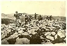 The Battle of Deçiq (Albanian: Beteja e Deçiqit; Serbian: Bitka kod Dušića/ Битка код Душића) was a battle between Albanian tribesmen and Ottoman forces during the Malësori uprising of 1911. It was a turning point for Albania's secession from the Ottoman Empire.[3] Dedë Gjo Luli, the organiser of the Albanian tribal forces, raised the Albanian flag for the first time since 1479 on the mountain of Deçiq after the Albanians had achieved victory over the Ottoman Turks.[4]
