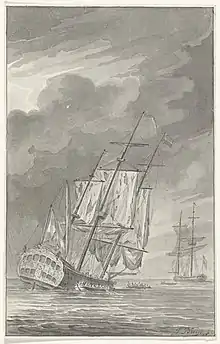 The Dutch were politically in turmoil, and were consequently unable to mount any sort of effective actions against the British.[5] The result of this inaction was the collapse of their economically important trade.[6] It was finally decided that a merchant fleet had to be launched. On 1 August 1781, Admiral Johan Zoutman led a fleet of some 70 merchantmen from the Texel, protected by seven ships of the line as well as a number of frigates and smaller armed vessels. Admiral Sir Hyde Parker was accompanying a convoy of ships from the Baltic when he spotted the sails of the Dutch fleet at 04:00 on the morning of 5 August. He immediately despatched his convoy toward the English coast, and ordered his line to give chase rather than prepare for battle.[7]:48 Zoutman, whose ships had been interspersed with the merchantmen, signalled his line to form in between Parker and the convoy. The ships of Parker's fleet were not in the best of condition, since great demands were placed on the Royal Navy by the demands of the war, and all manner of ships were pressed into service, or did not receive necessary maintenance. Some ships were in such poor condition that the number of guns available to fire was reduced from its normal complement. The ships had had no time to practise the normal fleet manoeuvres.[7]:46 In spite of this, Berwick and Parker's flagship Fortitude, both 74 guns, were both relatively new and in good shape. The Dutch crews were inexperienced as they had not seen any significant action due to the British blockade.