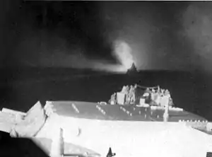 After firing her torpedoes, Samidare collided with Shiratsuyu.[23] Samidare and Shiratsuyu were subsequently forced to retire from the battle with Samidare receiving 5-inch hits at 03:00. Myōkō also collided with Hatsukaze, slicing off her bows.[26] Myōkō had significant damage from this collision. Meanwhile, Haguro was hit by several cruiser shells, only a few of which detonated.[27] Relying on visual tracking of their targets,[23] with difficulty, the Japanese cruisers pinpointed the American cruisers and opened fire at 03:13. At 03:20 the Cruiser Squadron fired several torpedoes at CruDiv 12.[28] At 03:27 numerous hits on CruDiv 12 were erroneously reported to Omori, but all actually missed their targets.[29]