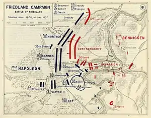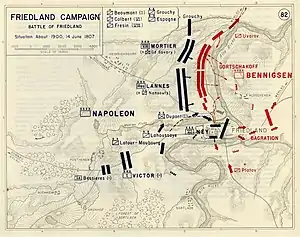 The engagement at Friedland was a strategic necessity after the Battle of Eylau earlier in 1807 had failed to yield a decisive verdict for either side. The battle began when Bennigsen noticed the seemingly isolated reserve corps of Marshal Lannes at the town of Friedland. Bennigsen, who planned only to secure his march northward to Wehlau and never intended to risk an engagement against Napoleon's numerically-superior forces, thought he had a good chance of destroying these isolated French units before Napoleon could save them, and ordered his entire army over the Alle River.[13] Lannes skillfully held his ground against determined Russian attacks until Napoleon could bring additional forces onto the field. Bennigsen could have recalled the Russian forces, numbering about 50,000–60,000 men on the opposite bank of the river, and retreated across the river before the arrival of Napoleon's entire army but, being in poor health, decided to stay at Friedland and took no measures to protect his exposed and exhausted army.[13] By late afternoon, the French had amassed a force of 80,000 troops close to the battlefield. Relying on superior numbers and the vulnerability of the Russians with their backs to the river, Napoleon concluded that the moment had come and ordered a massive assault against the Russian left flank. The sustained French attack pushed back the Russian army and pressed them against the river behind. Unable to withstand the pressure, the Russians broke and started escaping across the Alle, where an unknown number of them died from drowning.[14] The Russian army suffered horrific casualties at Friedland–losing over 40% of its soldiers on the battlefield.[15]