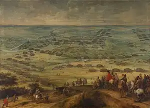 The Battle of Honnecourt, by Peter Snayers.[1] Perspective from the Spanish positions; note Abbey on left, and River Escaut directly behind