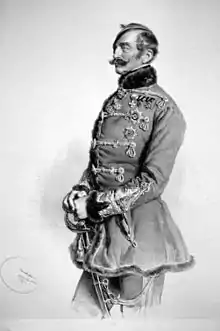 But then a handful of the infantry uhlans of the Polish Legion and the 20th Honvéd Battalion took a stance in their way at the tavern from Bárca. Major Wladyslaw Tchorznicki, the leader of the group, was a true veteran, having fought in the Polish uprising of 1830-31.[6] He took up a position behind the stone wall of the tavern with his soldiers, let the Imperial Cavalry close in, and then poured such a volley of fire on them that Major Concorreggio and several of the officers were killed, Scudier was wounded and taken prisoner, and the others fled struck by panic.[6] Thanks to them the rest of the Hungarian army could retreat to Miskolc unharmed.[6]