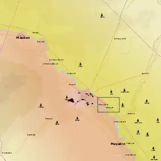 The US Central Command stated that pro-government forces had "initiated an unprovoked attack against well-established Syrian Democratic Forces headquarters" in the area, while coalition service members were "co-located with SDF partners during the attack 8 kilometers (5 mi) east of the agreed-upon Euphrates River de-confliction line".[18][19][20] The Russian Ministry of Defence's statement, released on 8 February 2018, referred to the incident at the village of Salihiyah (located south of the SDF-held town of Abu Hamam in the Abu Kamal District) and said that it was caused by reconnaissance actions of Syrian militias that had not been cleared with the Russian operations command; the statement stressed that there were no Russian service members in the "designated district of the Deir ez-Zor province of Syria".[21][22]