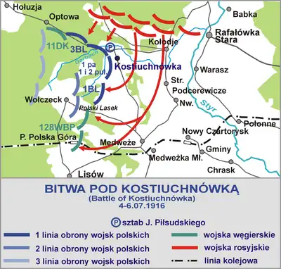 The Polish Legions first arrived in the vicinity of Kostiuchnówka during the advance of the Central Powers in the summer and autumn of 1915, taking Kostiuchnówka on September 27, 1915.[6] That autumn they experienced heavy fighting, with each side trying to take control of the region; a less known battle of Kostiuchnówka took place from November 3 to 10; the Russians managed to make some advances, taking the Polish Hill, but were expelled by the Polish forces on September 10.[4] Polish forces held Kostiuchnówka, and due to their successes in defending their positions, several landmarks in the Kostiuchnówka region became known as "Polish" (called such by Polish as well as by allied German-speaking troops): a key hill overlooking the area became the Polish Hill (Polish: Polska Góra), a nearby forest – the Polish Forest (Polski Lasek), a nearby bridge over the Garbach – the Polish Bridge (Polski Mostek), and the key fortified trench line – Piłsudski's Redoubt (Reduta Piłsudskiego).[6] Polish soldiers built several large wooden camps; the larger of which was known as Legionowo (where the Polish HQ was located).[4] During the preceding late autumn, winter and spring there were no major moves by either side, but this changed drastically with the launching of the Brusilov Offensive in June 1916.[6] It would be a major Russian victory, and the greatest of Austro-Hungarian defeats.[7]