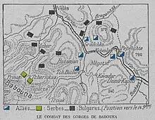 The French and British divisions marched north from Thessaloniki in October 1915 under the joint command of the French General Maurice Sarrail and British General Bryan Mahon. From the 15–16 October, the French 57th, 122nd and 156th divisions, including two regiments of Chasseurs d'Afrique and one of Zouaves, reached the Gevgelija and Strumica rail stations.[Note 1] On 20 October, the French divisions reached Krivolak on the Vardar river, while the British occupied the strategically important area between the Kosturino Pass, Vardar and lake Doiran. This advance aided the retreating Serbian army, as the Bulgarians had to concentrate larger forces on their southern flank to deal with a possible invasion of their territory. The French command then became aware of the Bulgarian presence in the Babuna Pass between Veles and Bitola and attempted to reach a group of Serbian soldiers located northwest of the pass.[9][10][11]