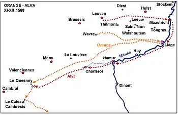 On 3 November 1568, Orange set up camp outside Liège.[4] The Prince-Bishop of Liège, Gerard van Groesbeeck, neither yielded to demands nor would he permit passage through his state.[5] Orange's army ransacked some monasteries.[6] The Prince Bishop of Liege, Groesbeck, appealed to Alva for help and initially Alva reinforced Liège and Huy (Dutch: Hoei; Walloon: Hu) with companies of Walloons. Orange, hoping to gain submission of the city and passage for his troops, demonstrated an assault on Liège during the night of 4–5 December, but hearing that Alva’s main army was approaching he abandoned the siege on the morning of 5 December.[4]