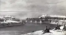 The French army crossed the bridge at Lesmont on the night of 2 February protected by troops under Ney's command, who then retired. Lagrange's division remained in the village to cover the retreat and took up position on the right bank of the river behind the bridge.[3] It was soon attacked by Eugen's cavalry and elements of von Wrede's corps.[3]