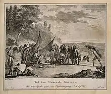 Badly injured, Marceau remained in Altenkirchen and received several visits from Austrian officers, including Paul Kray. He died two days later in the early morning on 21 September, just before the Archduke arrived to pay his respects. On 23 September, the Austrians handed Marceau's body to the French at the bridgehead in Neuwied, and he was buried in Coblenz.[7] Both sides offered gunfire salutes. Jacques Philippe Bonnaud was also killed in the rear guard action.[2]