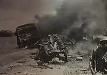 The Tanzanian-UNLF force was thus able to get close enough to use their mortars without suffering significant casualties.[32] After two misses, the Tanzanians struck the lead Land Rover in the Ugandan column, setting it ablaze. They gradually advanced their fire down the road, and within a few minutes most of the vehicles had been destroyed. The wreckage of the convoy burned, detonating fuel and ammunition stocks. A single Land Rover that had avoided being struck drove towards the Tanzanians in an attempt to effect a breakout. It was disabled with gunfire, and its three occupants were shot as they attempted to flee.[31] The surviving Uganda Army soldiers scattered and fled into the nearby swamp along the left side of the road. They were pursued by the UNLF fighters,[34] while the Tanzanians celebrated their victory and took measure of the Uganda Army's losses.[32][11][34] When the UNLF fighters returned to the road with eight prisoners, they were thus ignored by the Tanzanian soldiers. The militants discussed what to do with the captured soldiers, with some arguing for summary execution, and others for turning them over to the Tanzanian military. One UNLF fighter eventually decided the dispute on his own by simply shooting the prisoners.[35]