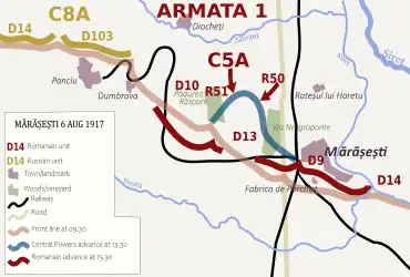 The Central Powers planned a dual pincer movement attack: an offensive towards Adjud and an offensive towards Oituz. The Battle of Mărășești was fought between 6 August and 3 September, in an area marked by the towns of Focșani, Panciu and Mărășești, along the Siret River.