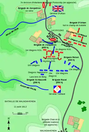 The Battle of Majadahonda (11 August 1812) saw an Imperial French cavalry division led by Anne-François-Charles Trelliard attack two brigades of cavalry under Benjamin d'Urban and forming the advance guard of Arthur Wellesley, Earl of Wellington's army. Trelliard's leading brigade routed d'Urban's Portuguese horsemen and overran three British cannons. King's German Legion (KGL) cavalry led by Eberhardt Otto George von Bock intervened to halt the Imperial French horsemen, but were finally compelled to withdraw when Trelliard committed his second and third brigades to the contest. The Imperial French cavalry was unable to cope with a KGL infantry battalion defending a village and they withdrew at the approach of additional British cavalry and infantry. This Peninsular War action was fought near Majadahonda, which is located 16 kilometres (9.9 mi) northwest of Madrid.