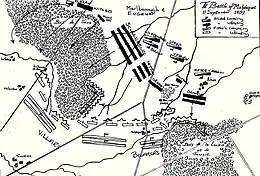 Meanwhile, pressure from Prince Eugene forced Villars to keep moving troops from the centre to prevent the collapse of his left wing. Withers and the detachment from Tournai arrived too late to support the Dutch, and were instructed instead to make a flanking move north of the French lines in Sars Wood. This manoeuvre took over two hours to complete, by which time the fighting had largely ended, but their approach forced Villars to reinforce his left with another twelve battalions.[24] By midday, he had taken over seventy-seven battalions from the centre, leaving nine French battalions and sixty cavalry squadrons facing twenty-three and eighty respectively.[25] This allowed Orkney's infantry to over-run their positions in the early afternoon; soon after, Villars was badly wounded and transferred command to Boufflers, with Puységur taking over the left.[26]