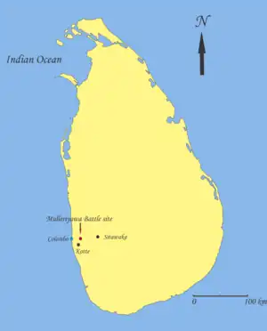 The Battle of Mulleriyawa (Sinhala: මුල්ලේරියාව සටන) in 1559 was part of the Sinhalese–Portuguese War. It was one of the most decisive battles in Sri Lankan history and considered as the worst defeat of Portuguese during that period. According to local chronicles the marshlands of Mulleriyawa turned red with blood after the annihilation of the Portuguese.[6] With this victory Sitawaka emerged as a military power which was able to challenge the Portuguese expansion.