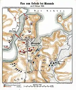 The Danish position at Mysunde was essentially a series of bastions placed around the village. The two most important bastions; referred to as A and B, were placed on either side of the southern road leading into the village. The position was defended by the 6th Fortification battalion led by Captain Hertel, who had at his disposition 20 cannons and about 100 men, as well as the 1st battalion of the 18th Regiment. Bastion A had 4, 24-pound and 4, 12-pound guns, while Bastion B had 4, 24-pound and 2, 12-pound guns. All of the Danish cannon were the old-fashioned muzzle-loading smoothbore variety, while the Prussians wielded more accurate and long-range breech-loading rifled cannon. The 3rd Brigade was bivouacked 11 km north of Mysunde in Reserve.[1]