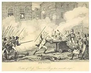 On 4 June 1798, the rebels advanced from their camp on Carrigbyrne Hill to Corbet Hill, just outside New Ross town.[1] The battle, the bloodiest of the 1798 rebellion, began at dawn[2] on 5 June 1798 when the Crown garrison was attacked by a force of approximately 3,000 rebels,[3] massed in three columns outside the town. The attack had been expected since the fall of Wexford town to the rebels on 30 May and the garrison, consisting of 2,000 troops, had prepared defences both outside and inside the town. Trenches were dug and manned by skirmishers on the approaches to the town while cannon were stationed facing all the rapidly falling approaches and narrow streets of the town to counter the expected mass charges by the rebels, who were mainly armed with pikes.