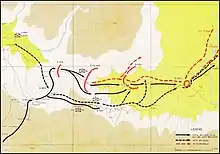 Several frontal assaults by the 16th Brigade, the lead Australian brigade, around Oivi were repulsed over several days with the Australians being subjected to heavy artillery fire,[13] until the Australian divisional commander, Vasey, decided to launch a flanking move towards Gorari, determining that in the circumstances he could afford move the 25th Brigade forward from Kokoda, leaving it largely undefended.[18] After stockpiling stores, the attack was commenced.[11] Two battalions – the 2/2nd and 2/3rd Infantry Battalions, as well as the Militia 3rd Infantry Battalion – pinned the Japanese defenders in place around Oivi, while the 2/1st, detached from the 16th, carried out a flanking move with the three battalions of the 25th Brigade – the 2/25th, 2/31st and 2/33rd Infantry Battalions – which were sent on a wide flanking move around Gorari by way of Kobara and Komondo.[19][11][20]