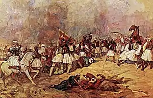 The Greek Army under Demetrios Ypsilantis which for the first time trained to fight as a regular European army rather than as guerilla bands, awaited Aslan Bey's forces at Petra, a town at a narrow passage in Boeotia between Livadeia and Thebes in order to dispute their passage. On September 12, 1829 the two armies engaged in battle. The Greeks, after a hail of gunfire, charged with swords and drove the Ottoman army into a disorderly retreat. The rest of the Ottoman army, now in danger of being surrounded, also retreated. The Ottoman army was unable to advance and as a result concluded a capitulation in 25 September 1829.[2] For both sides the casualties were relatively light. The Greeks suffered 3 dead and 12 wounded, the Ottomans about hundred dead.[3]