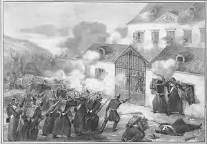 On the night of 3-4 March the Russians carried out a surprise attack on those rebels who slept in a building outside of the castle. Alarmed, the insurgents fought them, losing 2 men and then retreating from Pieskowa Skała. Those who failed to withdraw were killed by the Russians, and the castle itself was ransacked.[1] In the morning of 4 March the clash continued, as more Russian troops arrived to the area of Pieskowa Skała, chasing the insurgents, who tried to escape towards nearby Galicia. Among those insurgents who were killed in the battle was a Ukrainian revolutionary, Andrij Potebnia.