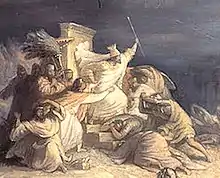 According to Herodotus, the Persian fleet initially numbered 1,207 triremes.[63] However, by his reckoning they lost approximately a third of these ships in a storm off the coast of Magnesia,[64] 200 more in a storm off the coast of Euboea,[65] and at least 50 ships to Allied action at the Battle of Artemisium.[65][66] Herodotus claims that these losses were replaced in full,[67] but only mentions 120 ships from the Greeks of Thrace and nearby islands as reinforcements.[68] Aeschylus, who fought at Salamis, also claims that he faced 1,207 warships there, of which 207 were "fast ships".[69] Diodorus[70] and Lysias[71] independently claim there were 1,200 ships in the Persian fleet assembled at Doriskos in the spring of 480 BC. The number of 1,207 (for the outset only) is also given by Ephorus,[72] while his teacher Isocrates claims there were 1,300 at Doriskos and 1,200 at Salamis.[73][74] Ctesias gives another number, 1,000 ships,[55] while Plato, speaking in general terms refers to 1,000 ships and more.[75]