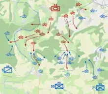 The X Corps' attack involved a strike on the left flank by the 213th Infantry Regiment and 7th Tank Battalion, and on the right flank by the 205th Infantry Regiment and 4th Tank Battalion.[72][75] The right flanking force arrived late, so the 213th Infantry and the 7th Tank Battalion advanced alone on the north axis. It was thought that the 213th could reach an area in between Chéhéry and Bulson in one hour fifty minutes and the 7th Tank Battalion in two hours.[72] Yet it was not until 17 hours after the original order to advance to Bulson that the lead French tanks reached the Bulson ridge. They found the Germans had beaten them there by a few minutes.[72]