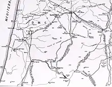The quick occupation of the Esdraelon Plain, 40 miles (64 km) behind the Ottoman front line, would place Desert Mounted Corps in the rear of the two Ottoman armies fighting in the Judean Hills and in control of their lines of communication.[8][12] The EEF cavalry would then be in a position to quickly control three lowland areas forming a semicircle around the Ottoman Seventh and Eighth Armies in the Judean Hills, from the Plain of Sharon, across the Esdraelon Plain to the Jordan Valley. They would then control the important Ottoman communications hubs at Afulah and Beisan.[8]